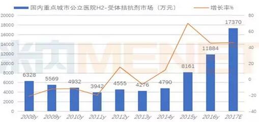 米內(nèi)網(wǎng)數(shù)據(jù)顯示,2016年國(guó)內(nèi)重點(diǎn)城市公立醫(yī)院H2受體拮抗劑用藥金額為1.19億元,同比上一年增長(zhǎng)率為45.62%。據(jù)2017年1~3季度數(shù)據(jù)估算,2017年國(guó)內(nèi)重點(diǎn)城市公立醫(yī)院替丁類藥物市場(chǎng)為1.74億元,同比上一年增長(zhǎng)率為46.16%。