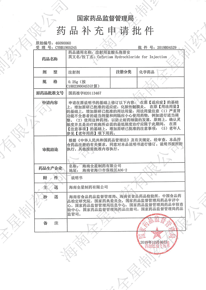 經(jīng)過公司研發(fā)團隊長期循證醫(yī)學研究,并結合上市原研藥品使用說明書,我公司向國家藥品監(jiān)督管理局提交的注射用奧美拉唑鈉、注射用鹽酸頭孢替安(4種規(guī)格)和注射用頭孢呋辛鈉(3種規(guī)格)適應癥的補充申請近日獲得批準,新核準的藥品使用說明書拓展了臨時用藥范圍,用法用量描述更詳細更為安全,提供了更加嚴謹?shù)挠盟幰罁?jù),有助于臨床醫(yī)生在一線工作中制定出更準確、更有效、更有針對性的治療方案。今后,公司將繼續(xù)提高研發(fā)力量,加強技術生產(chǎn)工藝,嚴把質量關口,為市場提供更多高品質、高標準的優(yōu)質產(chǎn)品,為2030年健康夢中國夢添磚加瓦,獻上我司的一份努力。